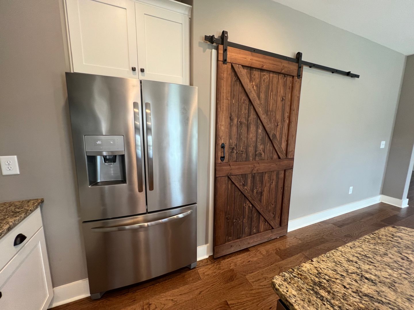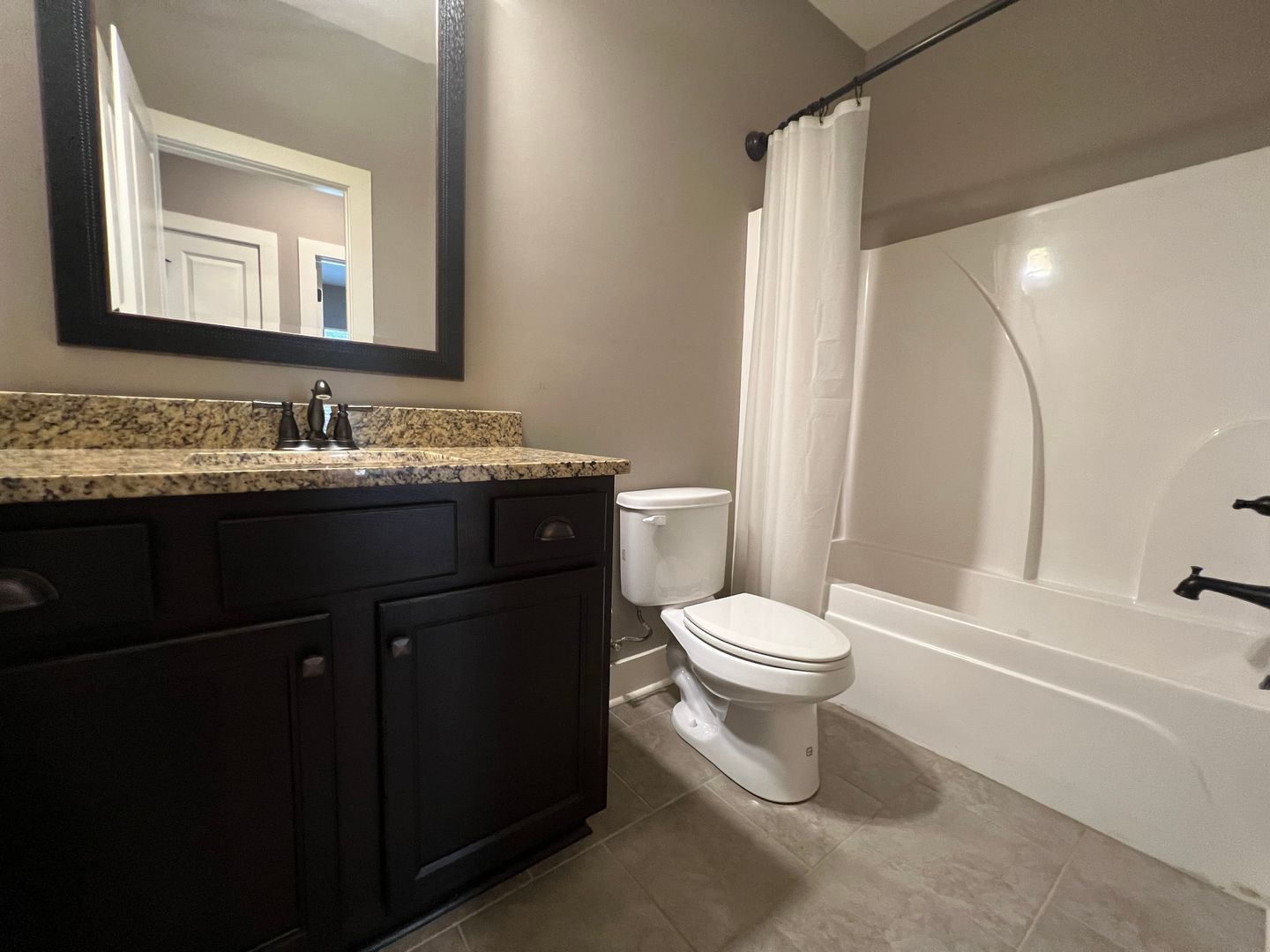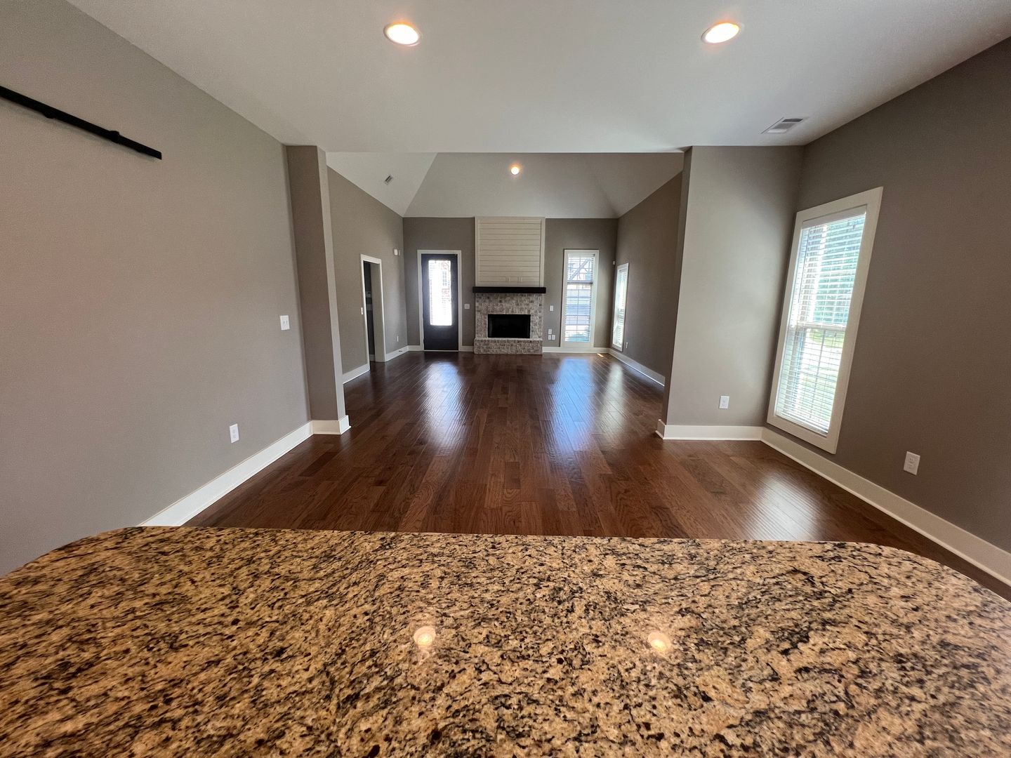 Cottage style house in Mimms Trail. Home has an open floor plan with a spacious living room with hardwood floors, a wood-burning fireplace and vaulted ceiling. Kitchen is open to the great room. Kitchen has a center island with an eat-in bar. Large walk-in pantry with a sliding barn door. Stainless steel appliances, granite countertops and subway tile backsplash.