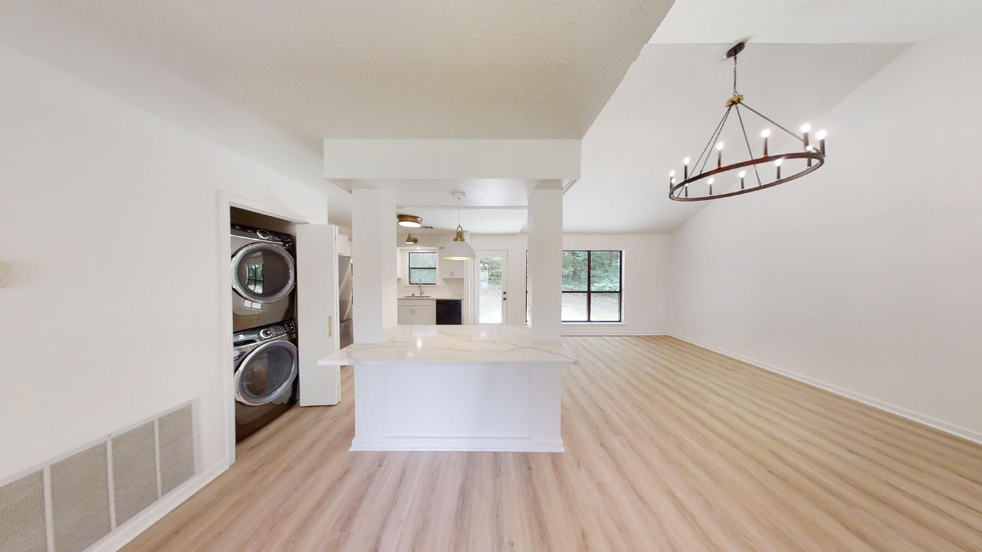 Fully renovated, one-story contemporary home located near Cary Woods. This property's renovations include: luxury vinyl plank floors throughout, interior and exterior paint, complete kitchen and bath remodel. Open kitchen and great room have an abundance of natural light with views of the wooded backyard. All bedrooms are spacious and updated with contemporary lighting. Bathrooms have clean lines and high end finishes.