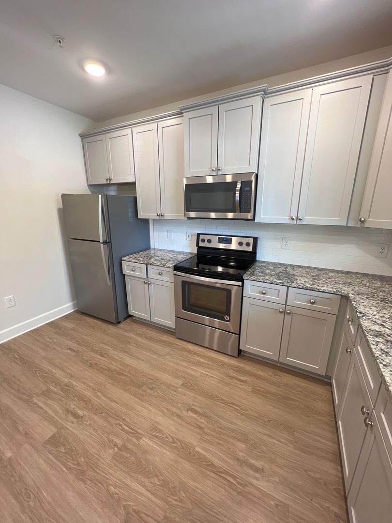 2 Bedroom/2 private bath upscale unit only a 1/2 mile from campus! Bottom floor unit! Crisp, modern finishes on interior and exterior. These units boast an upscale stainless steel appliance package. Also a full size washer and dryer. Vinyl wood plank flooring throughout unit. The living room includes a flat screen tv mounted on the wall.