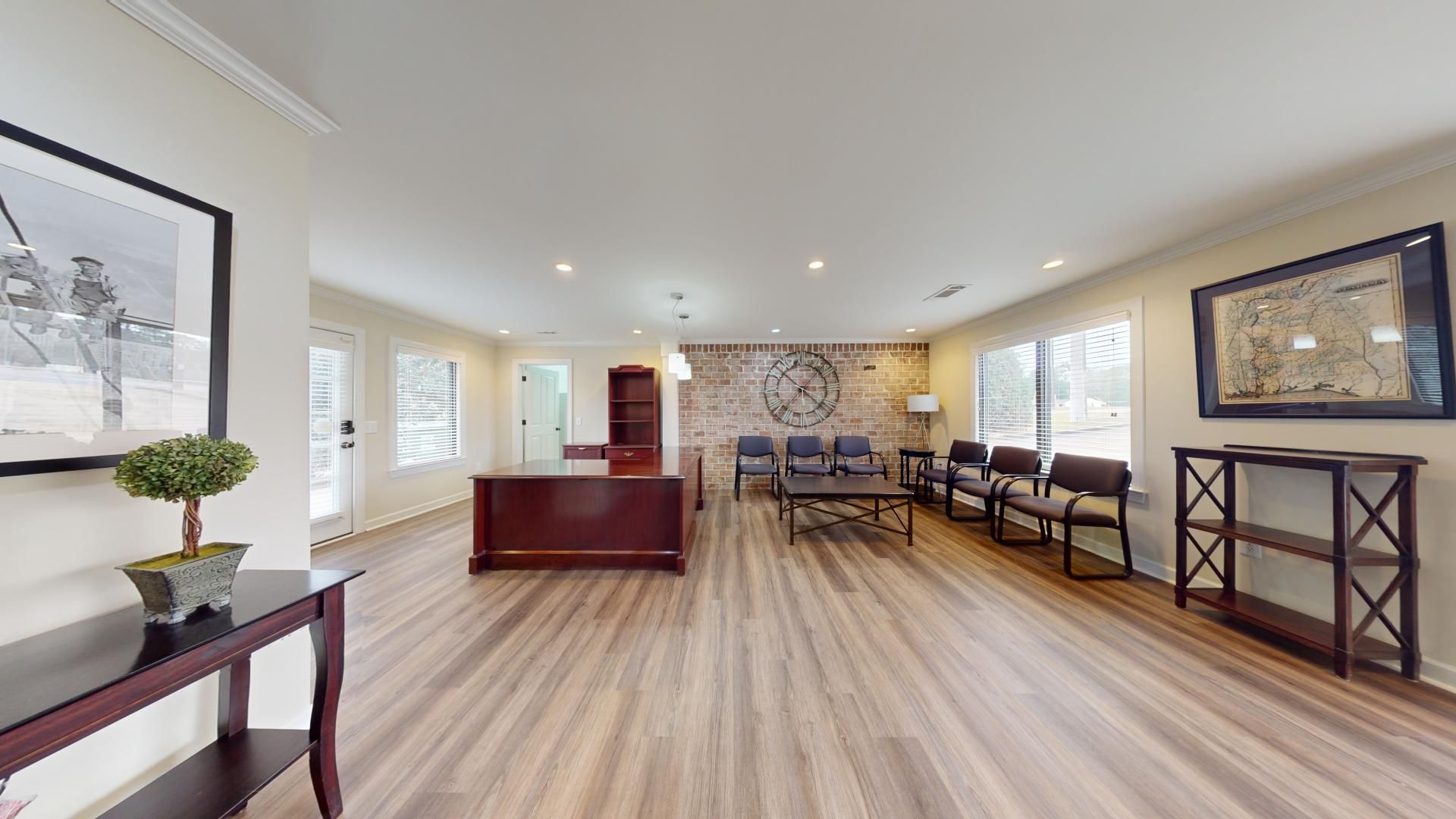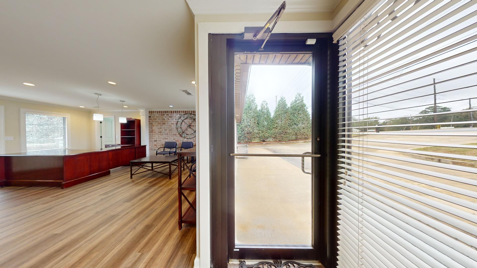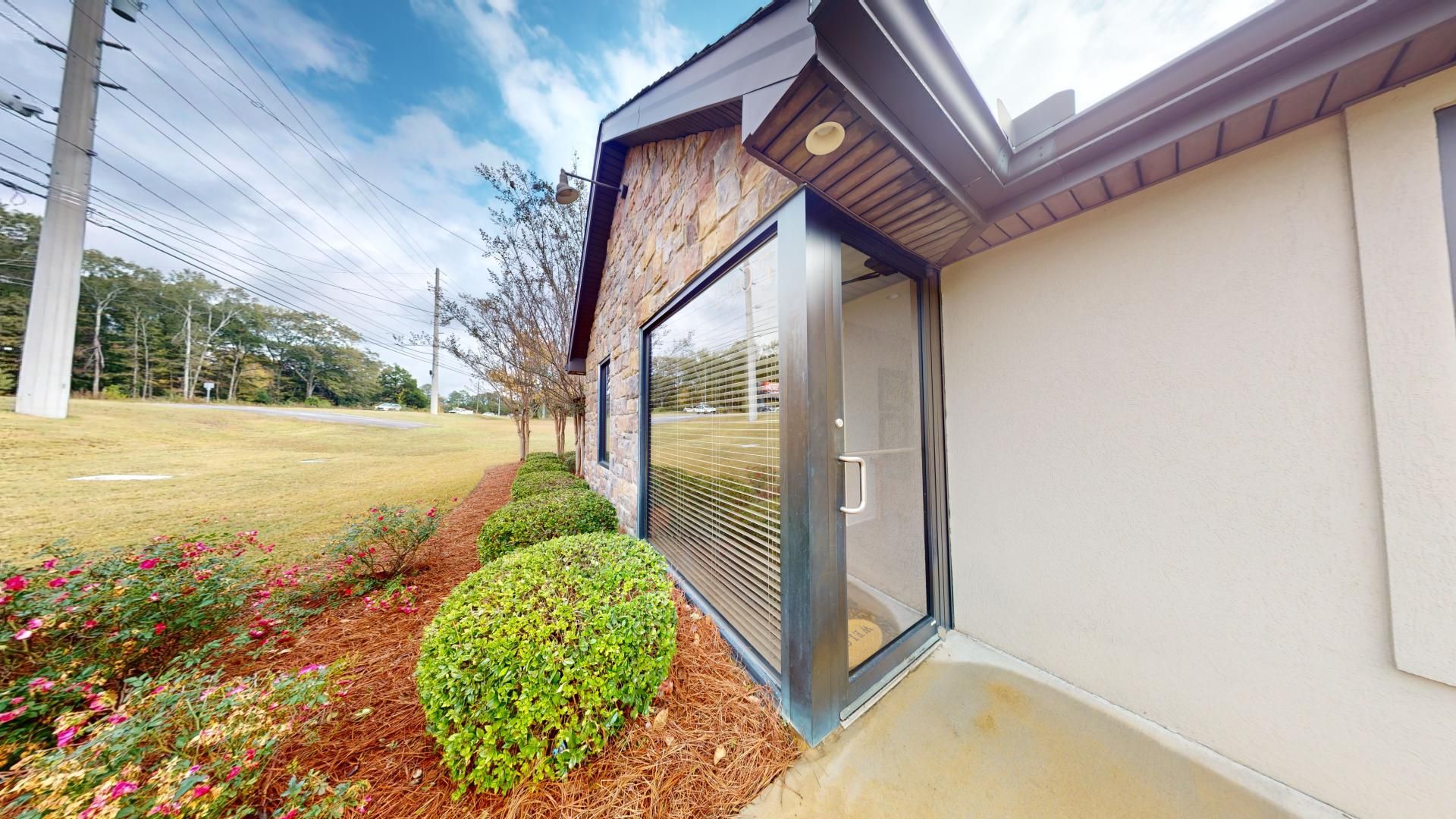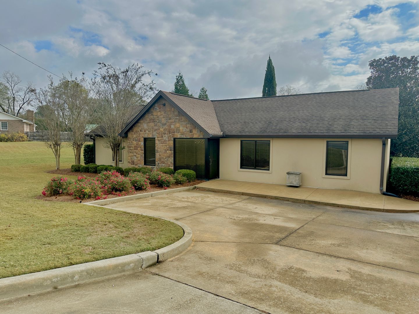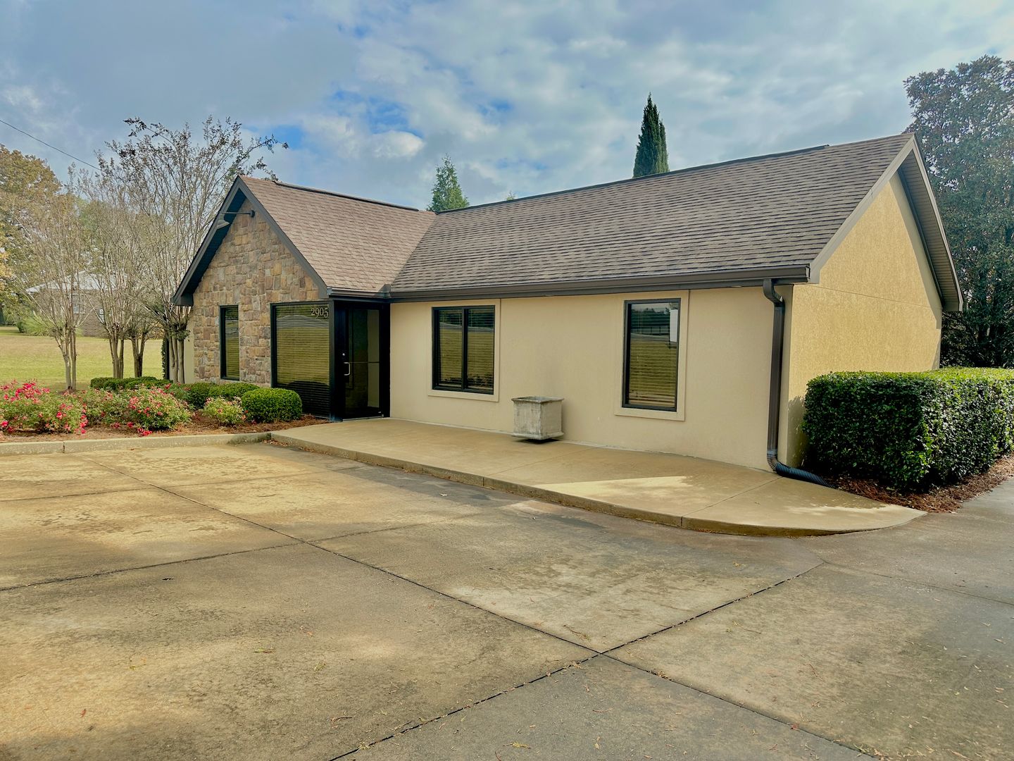 This one level office building has great visibility on one of the most used roads in Lee County. Just a few blocks from Tiger Town on Frederick Rd, this property offers nicely finished space with plenty of parking. Upon entry there is a large reception area that could have many different uses. One wall has a stone finish, and another with a brick finish. One side of the main reception room has a large office and storage closet with fridge. The other side has a small kitchenette area, then a hallway where there are 2 offices rooms and a another office currently being used as a conference room. This space has 2 bathrooms (one of which is a full bath). Out the back door is a nice patio area with a sidewalk leading to a very large parking lot. This property has many different uses to suit almost any kind of business needing office space. Lawn care included.