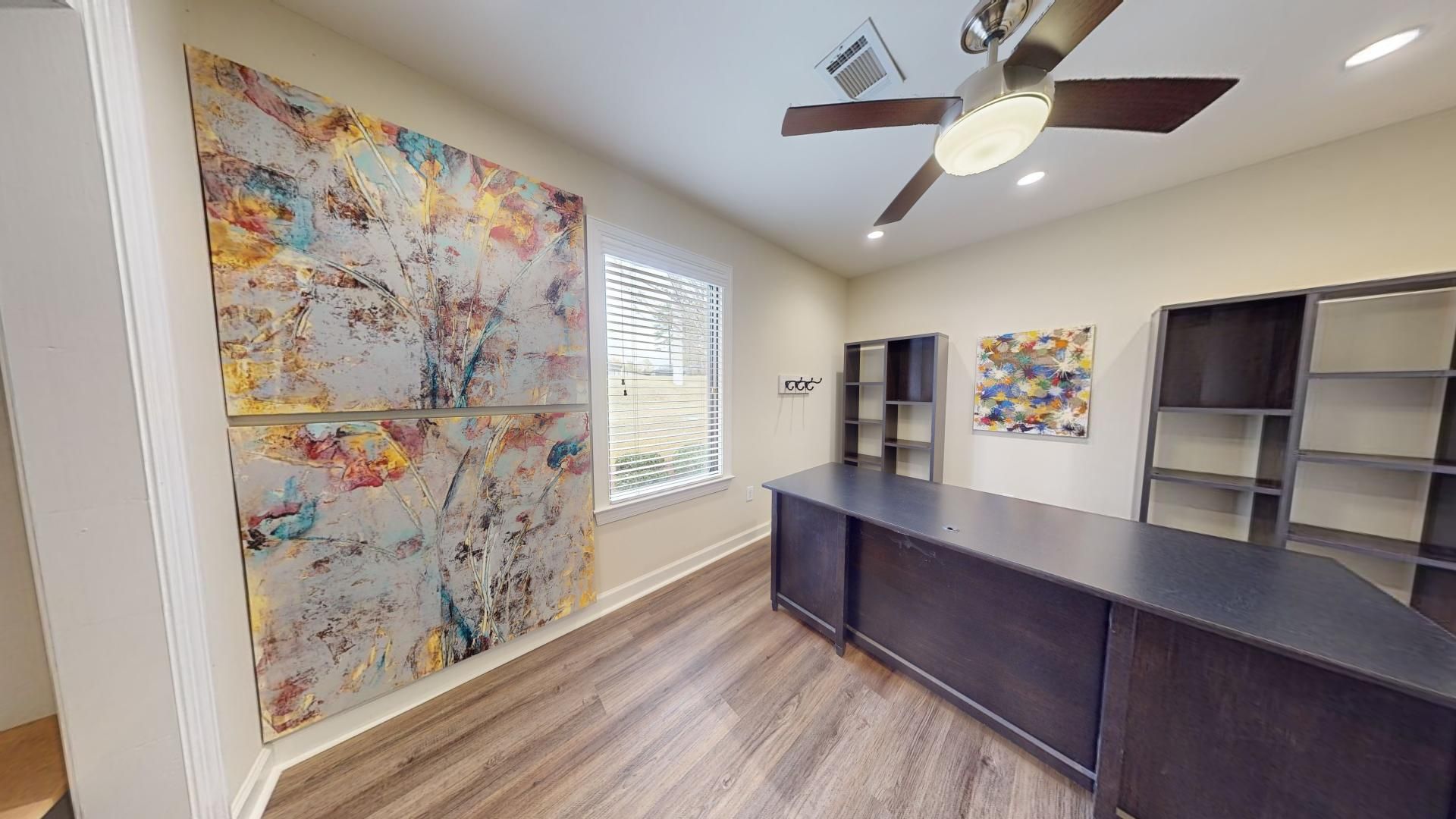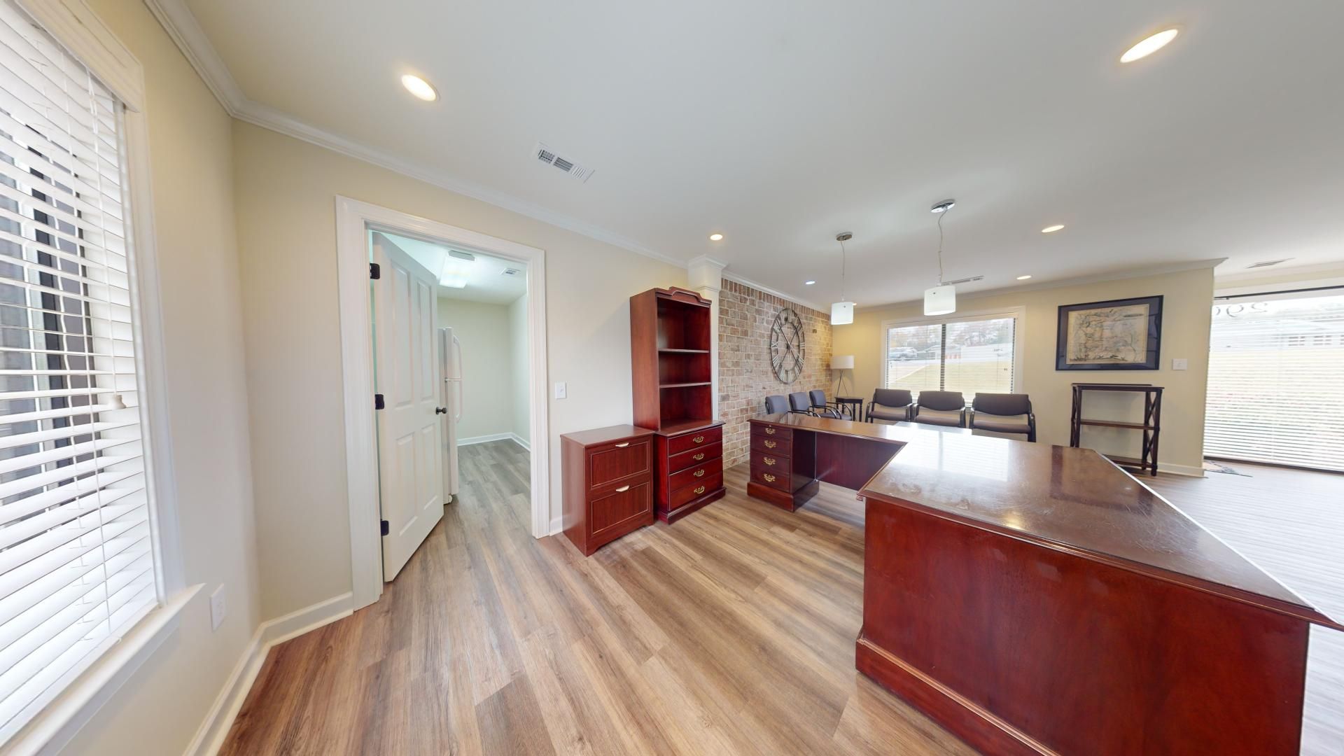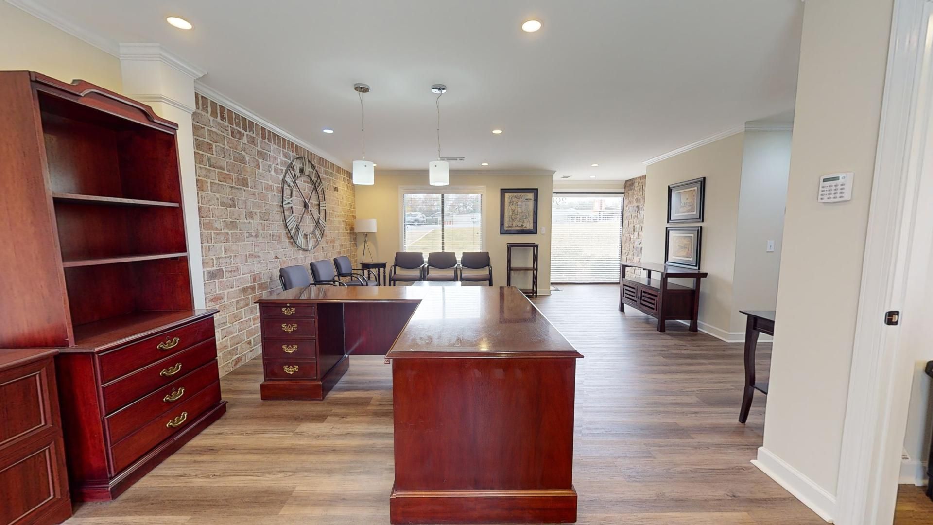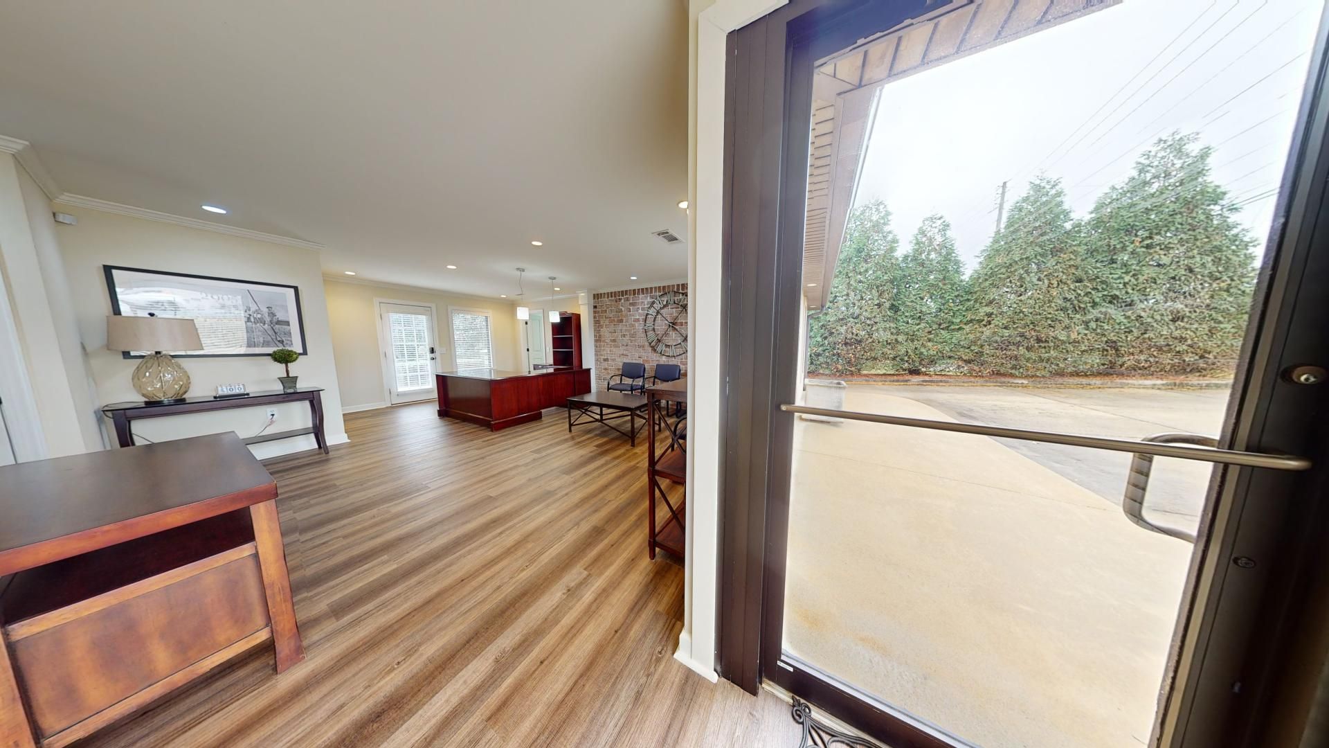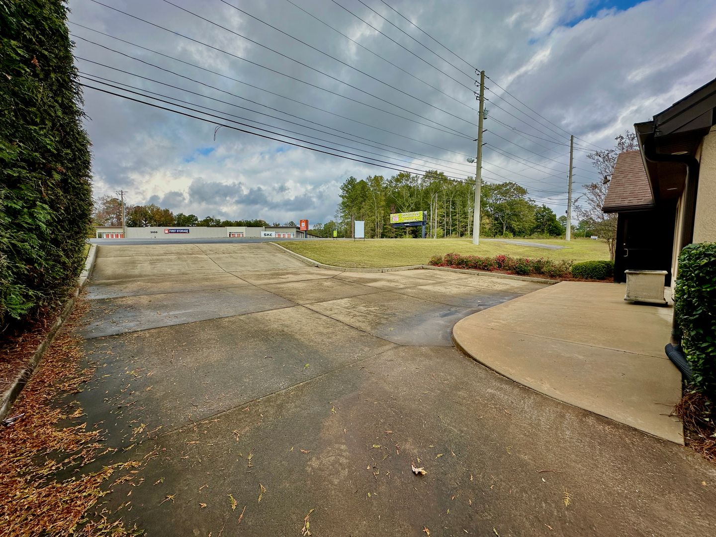 This one level office building has great visibility on one of the most used roads in Lee County. Just a few blocks from Tiger Town on Frederick Rd, this property offers nicely finished space with plenty of parking. Upon entry there is a large reception area that could have many different uses. One wall has a stone finish, and another with a brick finish. One side of the main reception room has a large office and storage closet with fridge. The other side has a small kitchenette area, then a hallway where there are 2 offices rooms and a another office currently being used as a conference room. This space has 2 bathrooms (one of which is a full bath). Out the back door is a nice patio area with a sidewalk leading to a very large parking lot. This property has many different uses to suit almost any kind of business needing office space. Lawn care included.